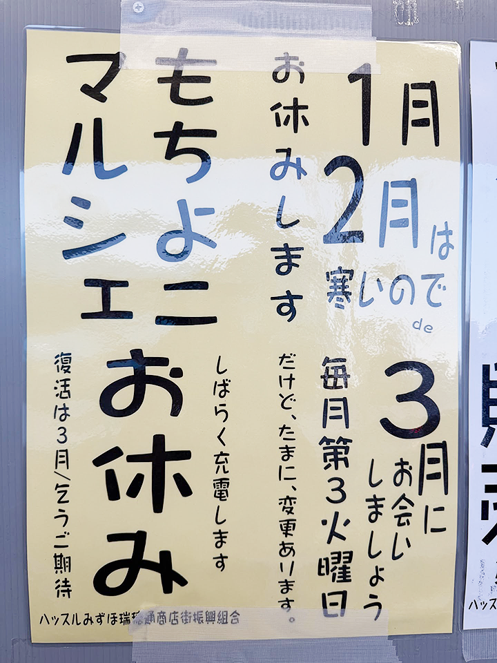 寒い季節のため、1月・2月のもちよこマルシェはお休みします。